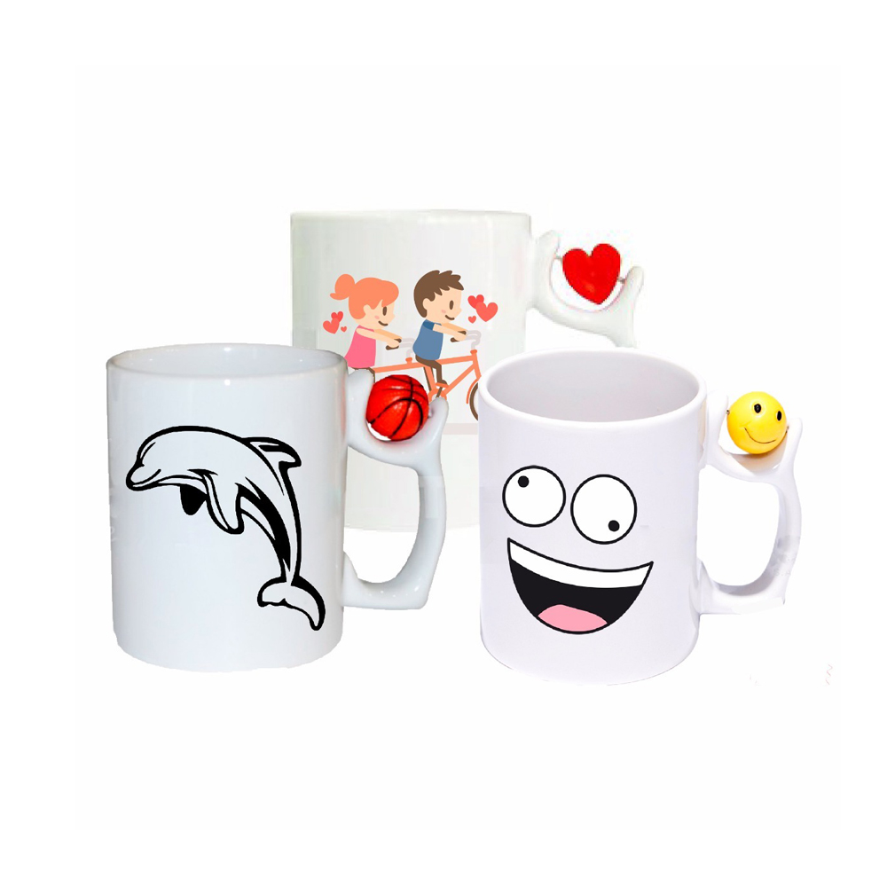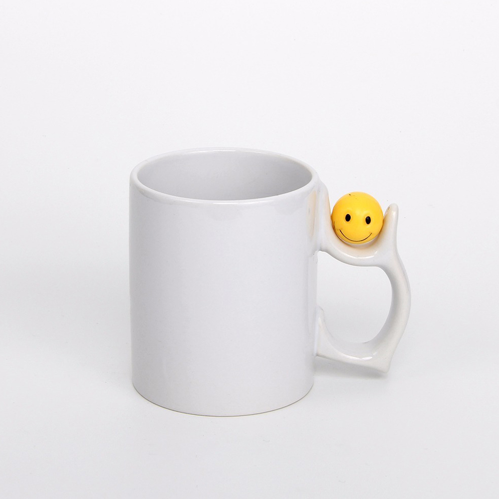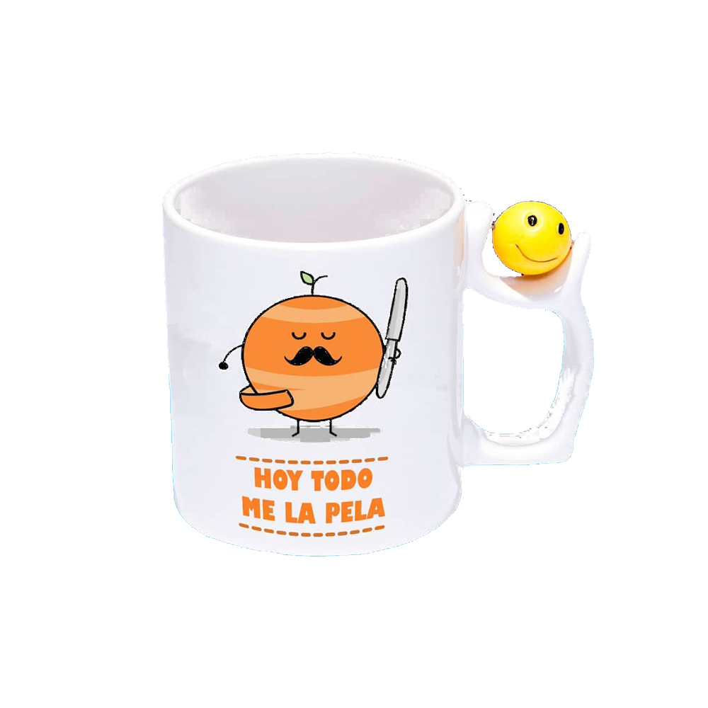 Mug blanco en cerámica con accesorio giratorio en la oreja con forma de cara feliz.